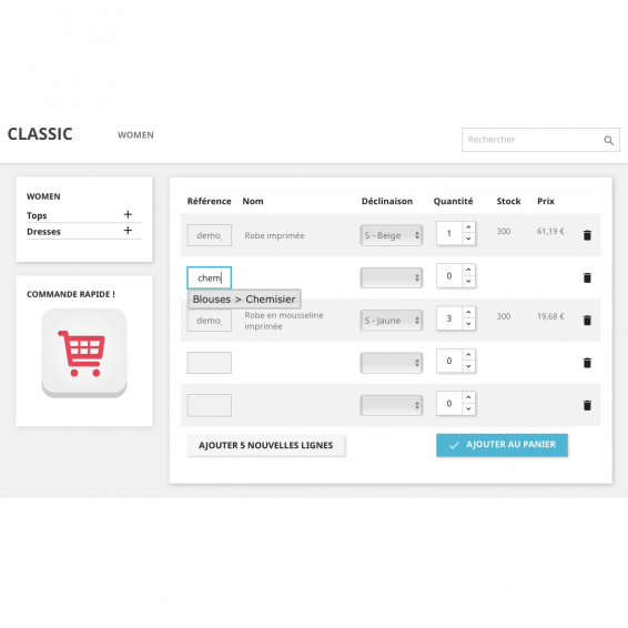 Thanks to this Prestashop module, a customer can add a product simply by typing its reference or its name. They find themselves faced with suggestions. Following this, they can choose the quantity they want and if the product is available to order.