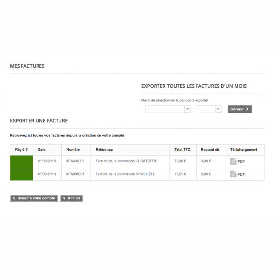 Module Prestashop « Mes Factures » : Offrez à vos clients B2B un espace dédié pour visualiser et télécharger leurs factures, distinct de l’historique des commandes. Améliorez la lisibilité de leur espace client en permettant le téléchargement individuel ou groupé (par date) des factures. Une solution professionnelle qui démontre votre attention aux besoins comptables de vos clients.