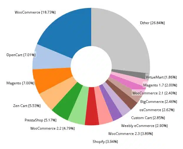 Selon le site BuiltWith, qui répertorie presque deux millions de sites e-commerce, WooCommerce serait en tête avec 19% des parts de marché. OpenCart et Magento sont à 7% et les parts de marché de PrestaShop ne représentent que 4,8%.